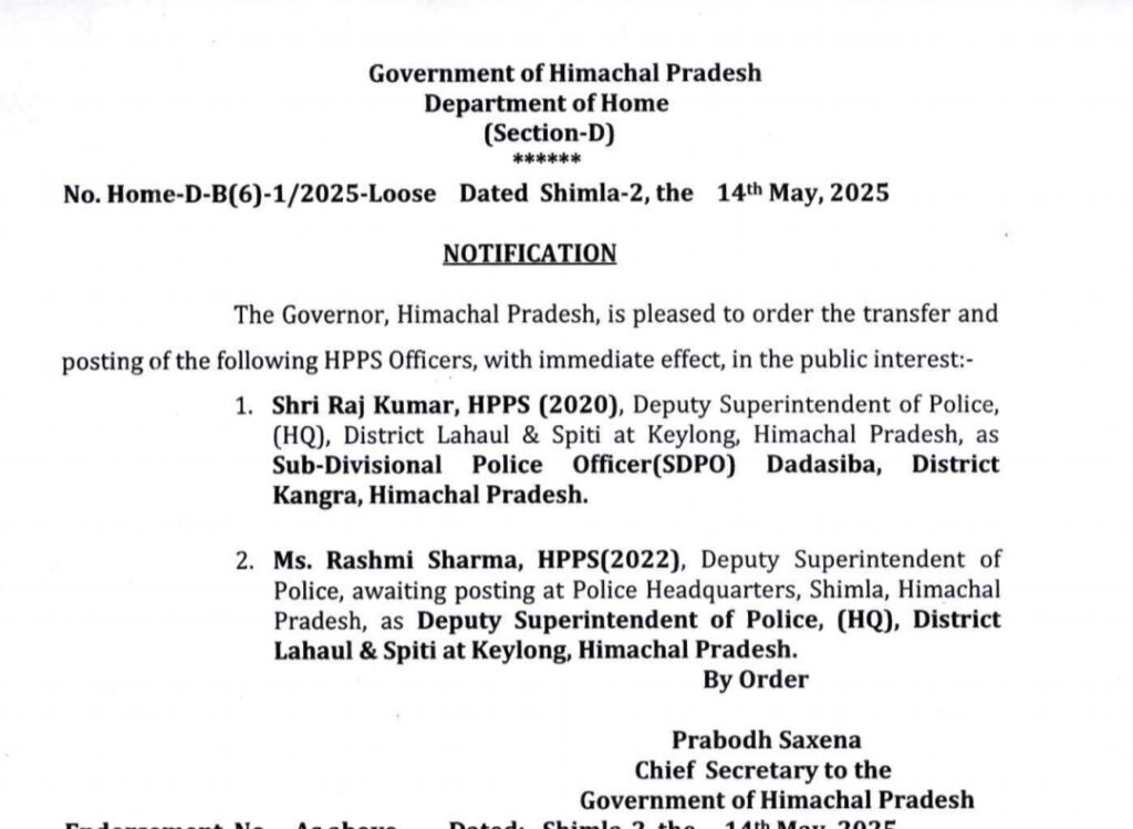 हिमाचल सरकार ने बुधवार को 4 अधिसूचनाएं जारी कर 7 अधिकारियों को बदला है। इनमें 3 IPS, 2 HAS और 2 HAS अधिकारी शामिल हैं।