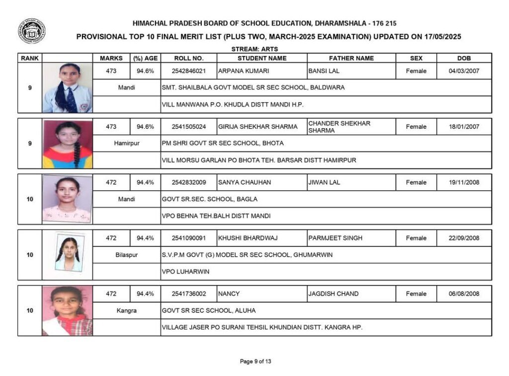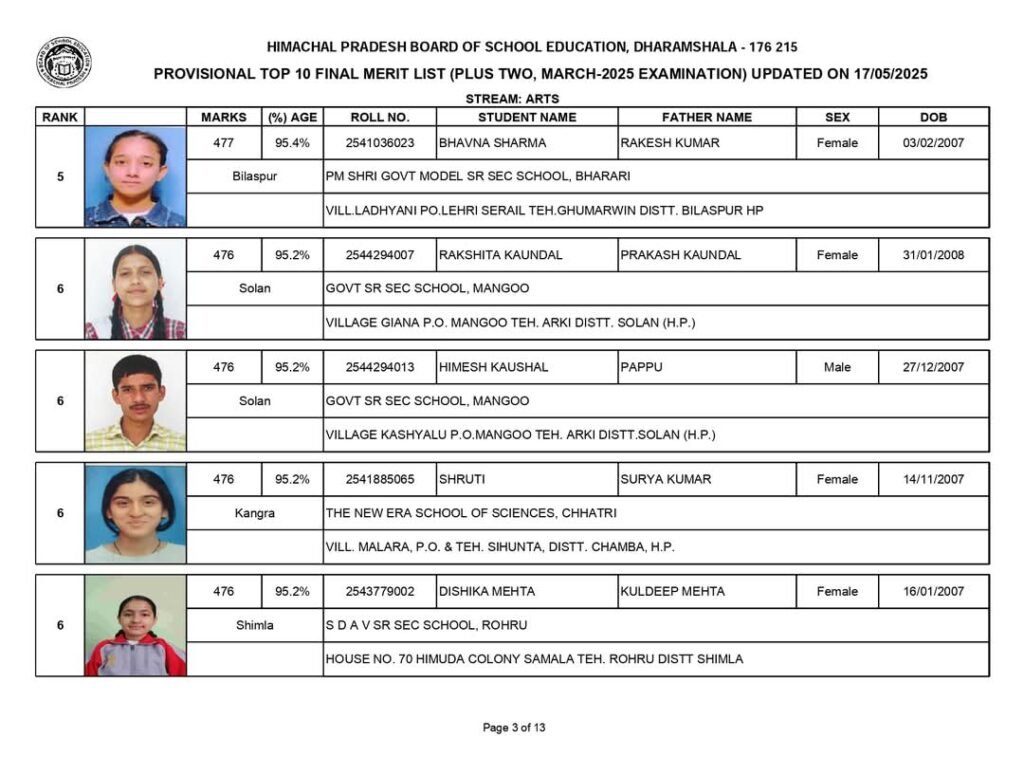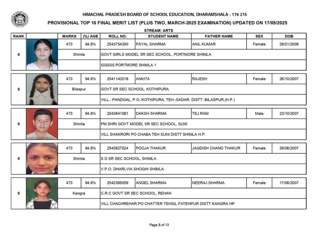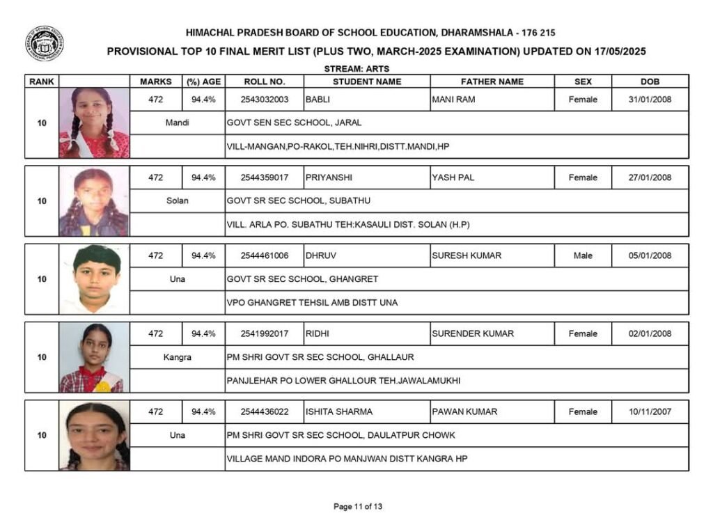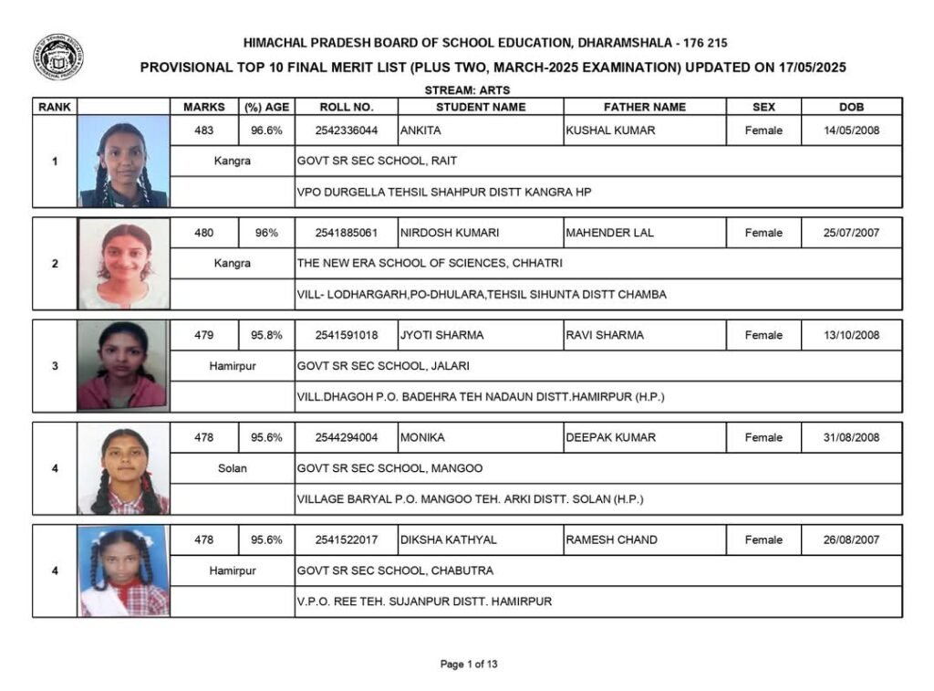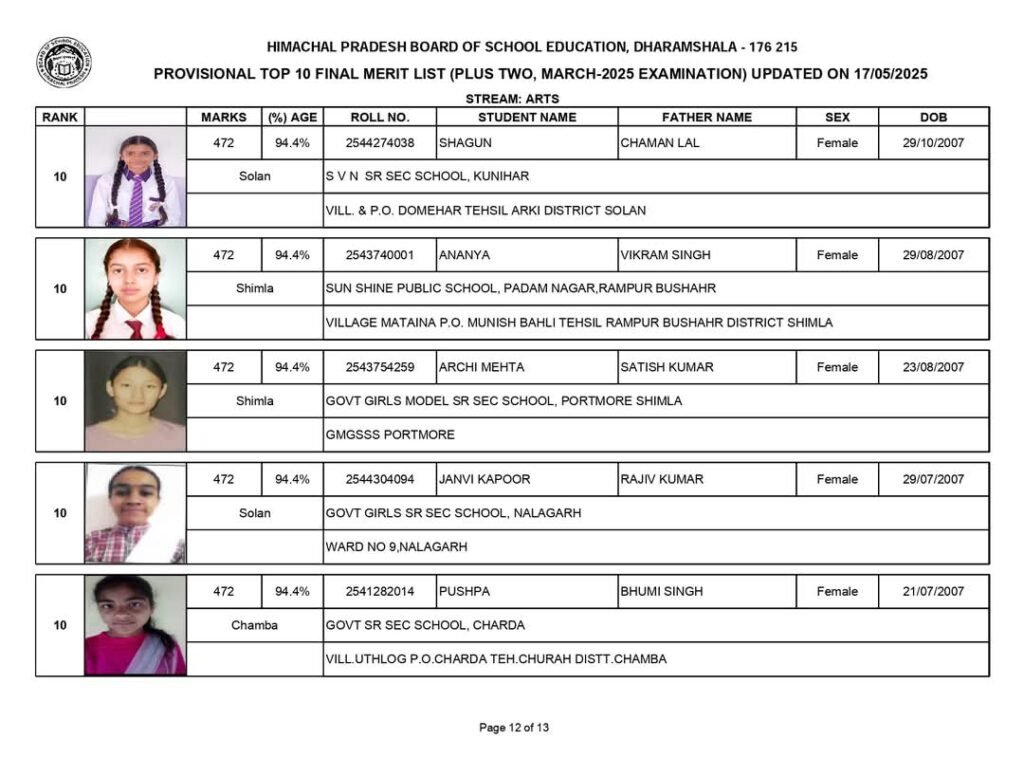 हिमाचल प्रदेश स्कूल शिक्षा बोर्ड (HPBOSE) धर्मशाला ने 12वीं कक्षा का परीक्षा परिणाम घोषित कर दिया है। इस वर्ष कुल 83.18 प्रतिशत विद्यार्थी सफल हुए हैं, जो पिछले वर्ष के 73.76 प्रतिशत के मुकाबले लगभग 10 प्रतिशत अधिक है।