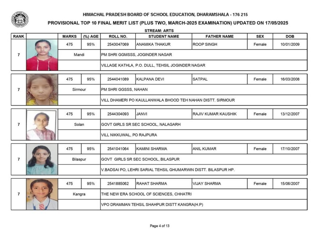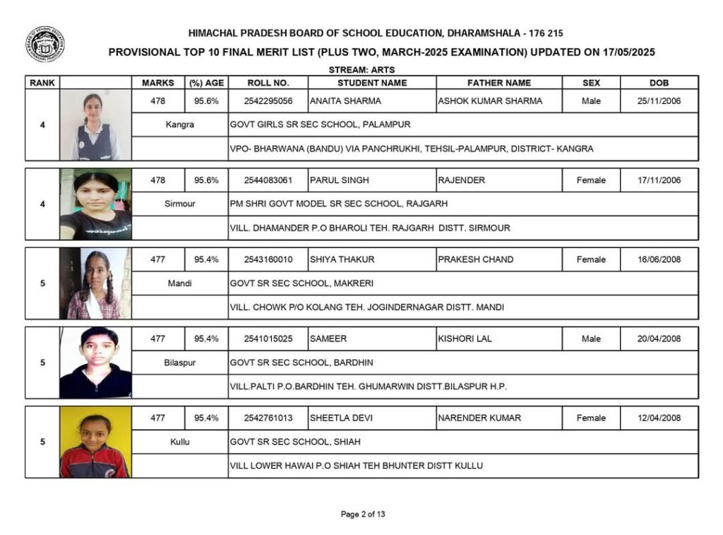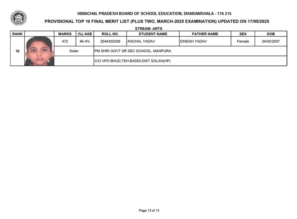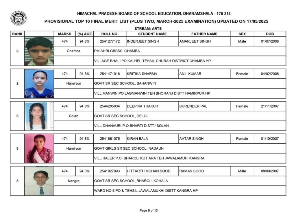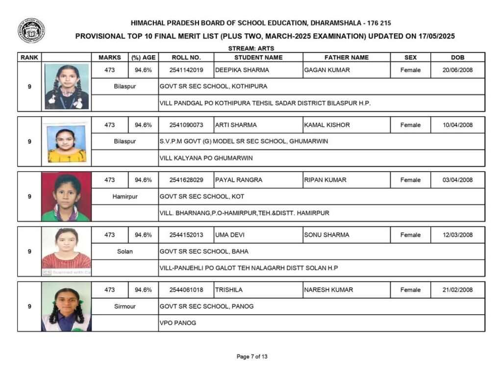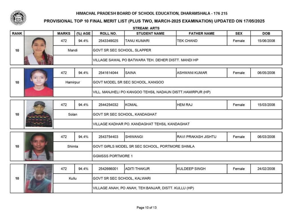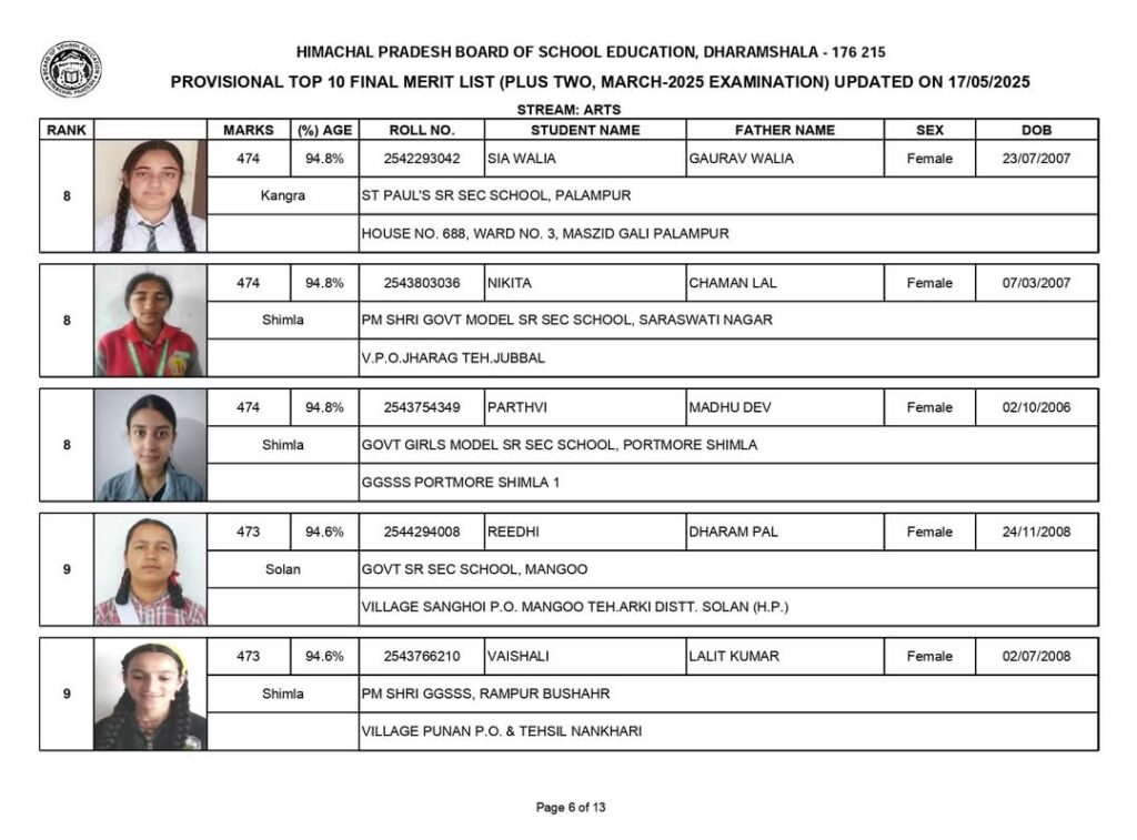 हिमाचल प्रदेश स्कूल शिक्षा बोर्ड (HPBOSE) धर्मशाला ने 12वीं कक्षा का परीक्षा परिणाम घोषित कर दिया है। इस वर्ष कुल 83.18 प्रतिशत विद्यार्थी सफल हुए हैं, जो पिछले वर्ष के 73.76 प्रतिशत के मुकाबले लगभग 10 प्रतिशत अधिक है।