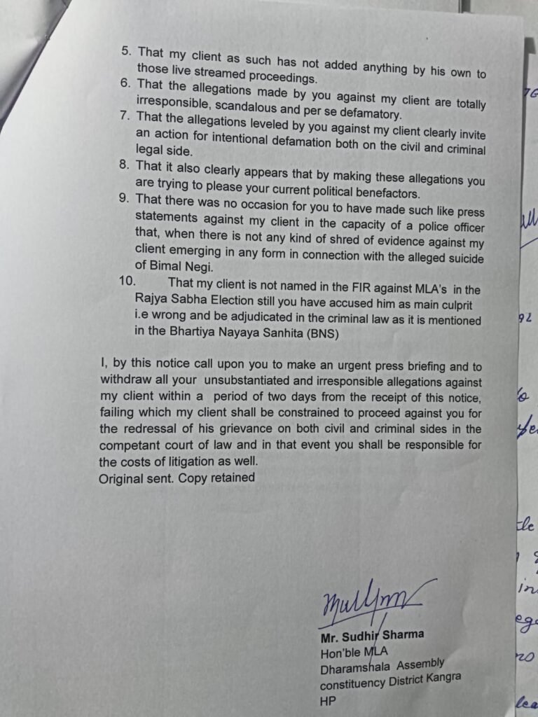 विधायक सुधीर शर्मा ने एसपी गांधी के आरोपों को निराधार बताते हुए उन्हें कानूनी नोटिस भेजा है। शर्मा का कहना है कि वीडियो क्लिप कोर्ट की अनुमति से लाइव स्ट्रीम की गई थी और इसमें कोई छेड़छाड़ नहीं की गई।