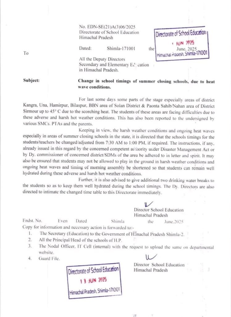 यह निर्णय विशेष रूप से कांगड़ा, ऊना, हमीरपुर, बिलासपुर, सोलन (BBN क्षेत्र), पांवटा साहिब/नाहन (सिरमौर जिला) जैसे गर्म क्षेत्रों के लिए लिया गया है, जहाँ तापमान 45 डिग्री सेल्सियस तक पहुंच गया है।