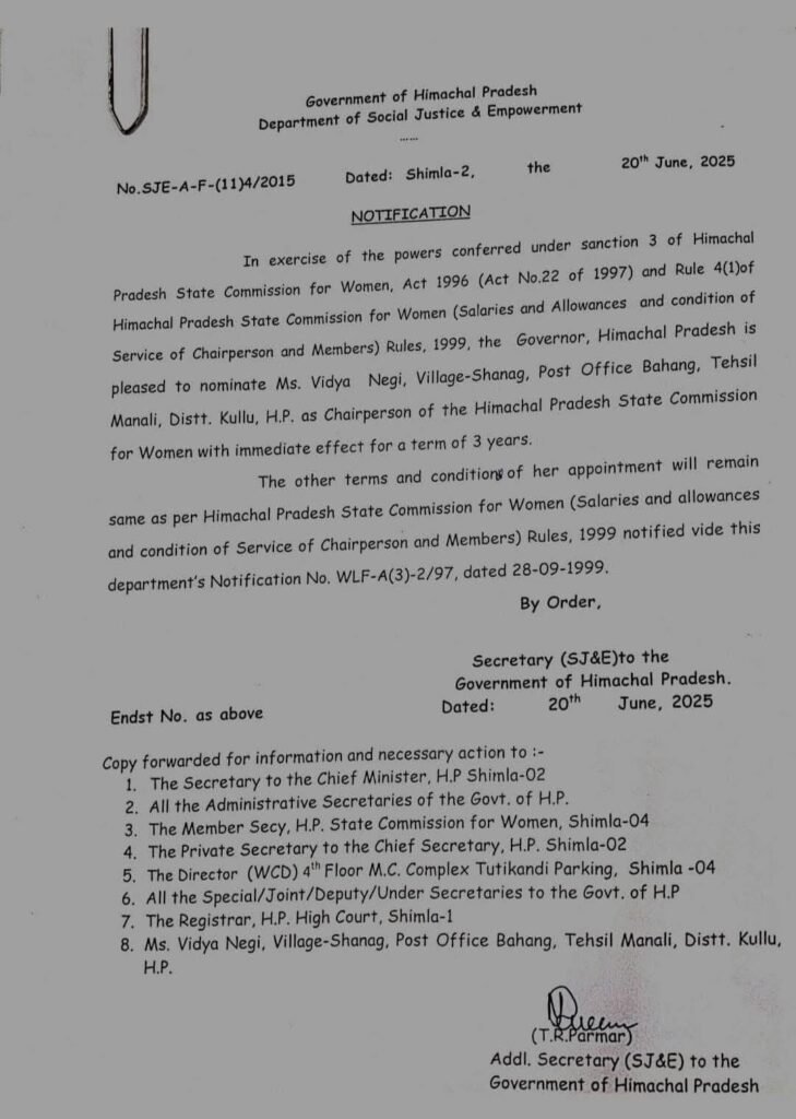यह नियुक्ति हिमाचल प्रदेश राज्य महिला आयोग अधिनियम, 1996 तथा सेवा नियम, 1999 के तहत राज्यपाल की स्वीकृति से की गई है। आयोग की सेवा शर्तें, वेतन और भत्ते 28 सितंबर 1999 को अधिसूचित नियमों के अनुसार निर्धारित होंगे।