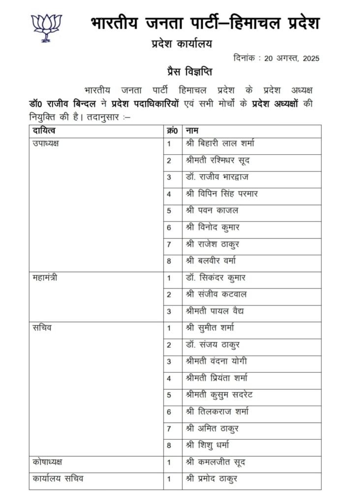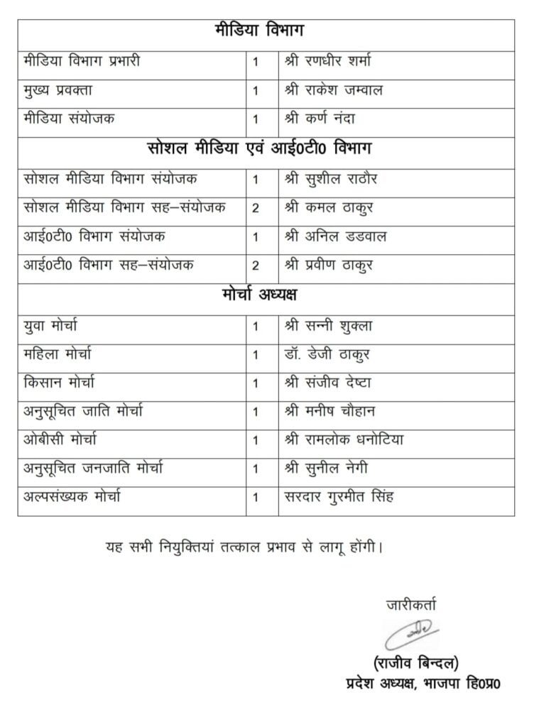 हिमाचल प्रदेश भाजपा की “नई टीम” का ऐलान हो गया है। प्रदेश अध्यक्ष डॉ राजीव बिंदल ने प्रदेश पदाधिकारियों की सूची जारी कर दी है। इनमें 8 उपाध्यक्ष 3 महामंत्री और सभी मोर्चों के पदाधिकारी शामिल हैं।