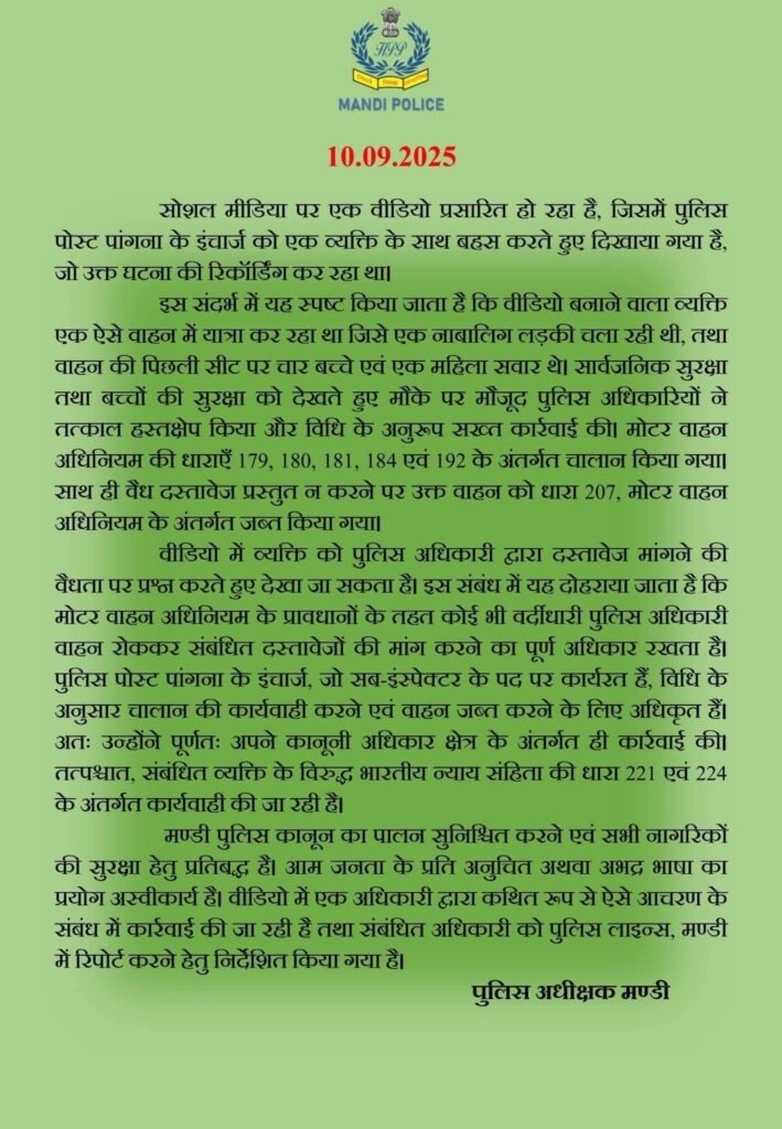 सोशल मीडिया पर वायरल हुए एक वीडियो को लेकर मंडी पुलिस ने आधिकारिक बयान जारी किया है। यह वीडियो पुलिस पोस्ट पंगाणा के इंचार्ज और एक व्यक्ति के बीच बहस का है।