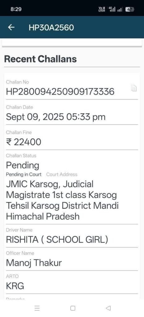 पुलिस ने बताया कि वाहन चालक के पास आवश्यक दस्तावेज़ उपलब्ध नहीं थे, जिसके चलते मोटर वाहन अधिनियम की धाराओं 179, 180, 181, 184 और 192 के तहत चालान किया गया। साथ ही वैध दस्तावेज़ न होने पर धारा 207 के अंतर्गत वाहन को जब्त कर लिया गया।