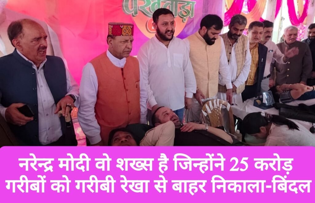 डाॅ. बिन्दल ने कहा कि नरेन्द्र मोदी वो शख्स है जिन्होनें 25 करोड़ गरीबों को गरीबी रेखा से बाहर निकाला, 80 करोड़ गरीबों को मुफ्त राशन देने का, 53 करोड़ गरीबों के जनधन खाते खुलवाने का, 9 करोड़ किसान परिवारों को 6000 रू0 प्रतिवर्ष किसान सम्मान निधि देकर उनके जीवन को सरल बनाने का, 4 करोड़ गरीबों को पक्के घर उपलब्ध कराने का, 12 करोड़ गरीबों को शौचालय बनाने का, 14 करोड़ घरों को नल से स्वच्छ जल देने का महत्वकांक्षी कार्य करते हुए गरीब के जीवन में आशा की किरण को पैदा किया। 50 करोड़ गरीबों के ईलाज के लिए आयुष्मान कार्ड बनाकर 5 लाख रू0 तक का स्वास्थ्य बीमा मुफ्त में प्रदान किया है।