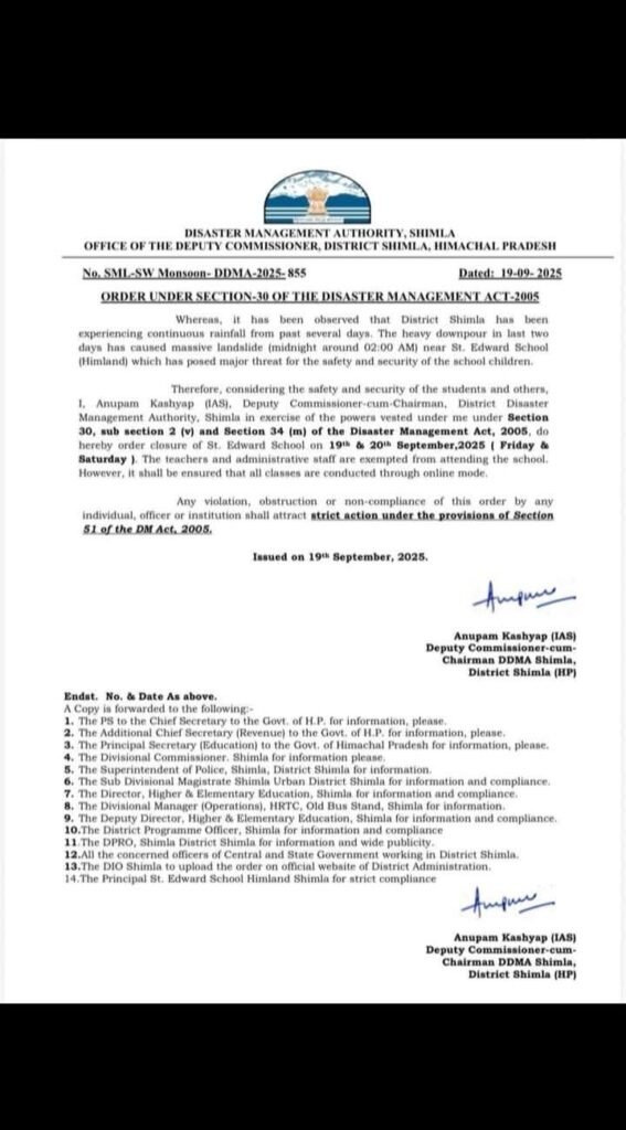 हिमलैंड में St. Edward स्कूल के सामने भूस्खलन से मकान को खतरा, सड़क अवरुद्ध, स्कूल में दो दिन का अवकाश घोषित