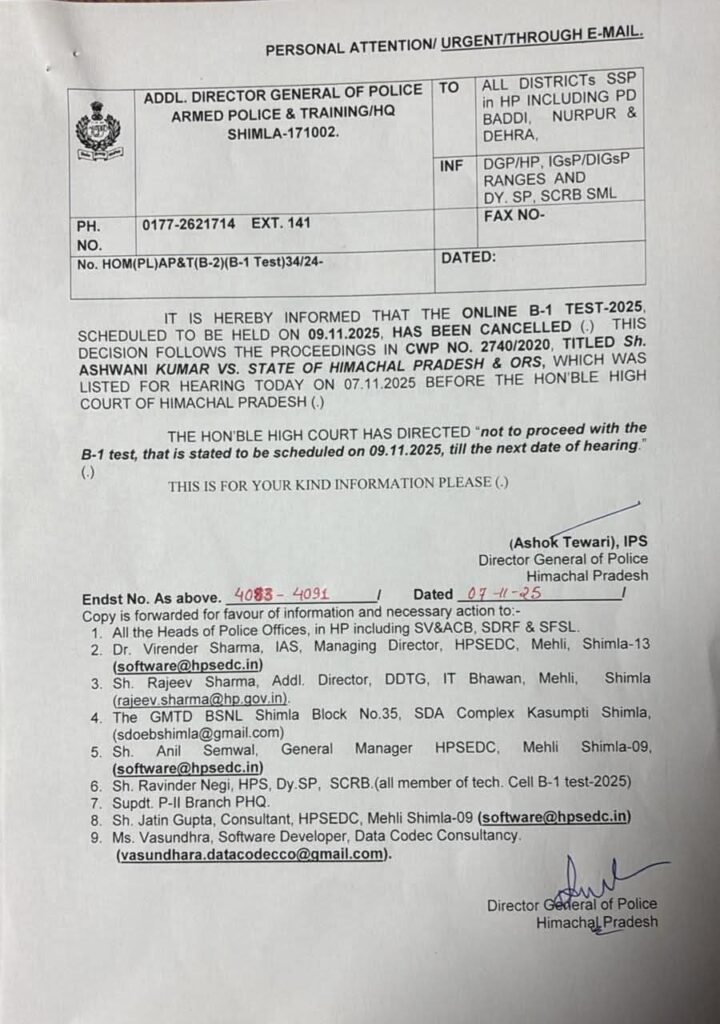 अतिरिक्त पुलिस महानिदेशक (प्रशिक्षण) कार्यालय, पुलिस मुख्यालय शिमला द्वारा सभी जिलों के पुलिस अधीक्षकों को सूचित किया गया है कि 09 नवम्बर, 2025 को प्रस्तावित ऑनलाइन B-1 टेस्ट-2025 को रद्द (स्थगित) कर दिया गया है।