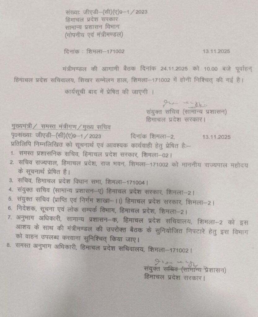हिमाचल प्रदेश विधानसभा के शीतकालीन सत्र से पहले मंत्रिमंडल की अहम बैठक 24 नवंबर को शिमला स्थित सचिवालय में होगी।