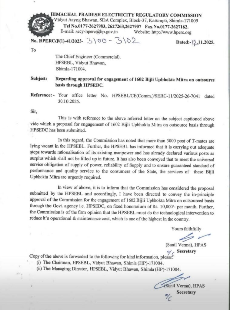 हिमाचल प्रदेश बिजली बोर्ड में उपभोक्ता सेवाओं को बेहतर बनाने के लिए 1602 विद्युत उपभोक्ता मित्रों की आउटसोर्स आधार पर भर्ती की जाएगी, जिसके लिए राज्य सरकार की एजेंसी हिमाचल प्रदेश स्टेट इलेक्ट्रॉनिक्स डेवलपमेंट कॉरपोरेशन प्रक्रिया पूरी करेगी।