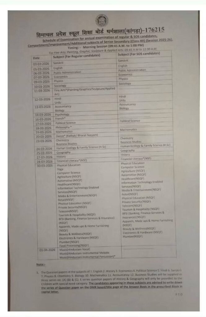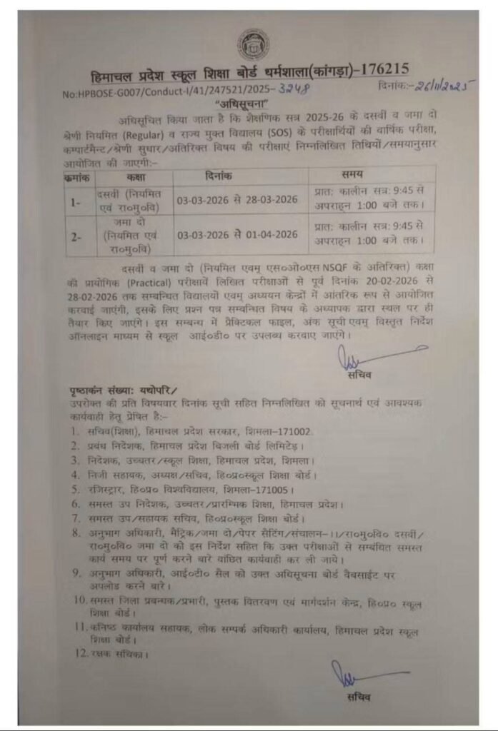 हिमाचल प्रदेश शिक्षा बोर्ड में 10वीं की वार्षिक परीक्षा 3 मार्च से