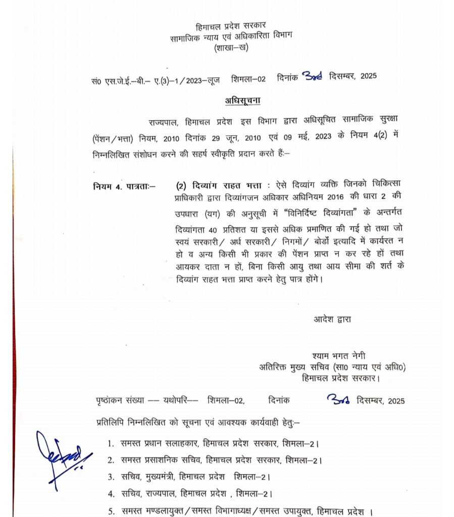 विश्व विकलांगता दिवस पर हिमाचल सरकार ने दिव्यांगजन के हित में बड़ा निर्णय लिया है। मुख्यमंत्री सुखविंदर सिंह सुक्खू के निर्देश पर राज्य सरकार ने सामाजिक सुरक्षा पेंशन व पब्लिक भत्ता नियम 2010 में संशोधन करते हुए दिव्यांग राहत भत्ता की पात्रता में महत्वपूर्ण बदलाव किया है।