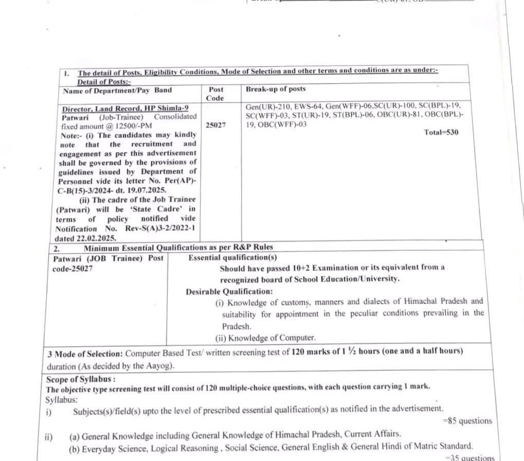 आयोग के सचिव डॉ. विक्रम महाजन ने बताया कि पोस्ट कोड 25027 के अंतर्गत पटवारी के सभी 530 पदों के लिए भर्ती प्रक्रिया शुरू कर दी गई है। विस्तृत जानकारी आयोग की वेबसाइट पर उपलब्ध है।