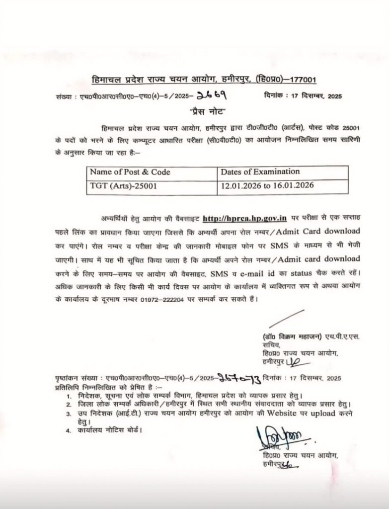हिमाचल प्रदेश राज्य चयन आयोग ने टीजीटी आर्ट्स भर्ती परीक्षा (पोस्ट कोड 25001) का शेड्यूल जारी कर दिया है। आयोग के अनुसार टीजीटी आर्ट्स का कंप्यूटर आधारित परीक्षा (CBT) 12 से 16 जनवरी 2026 के बीच आयोजित की जाएगी। परीक्षा तीन शिफ्ट में होगी।