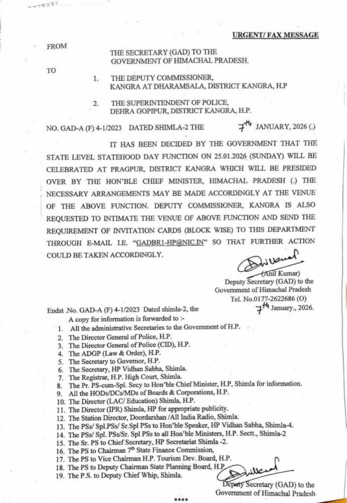 हिमाचल प्रदेश सरकार ने राज्यत्व दिवस समारोह को लेकर औपचारिक आदेश जारी कर दिए हैं। सरकार के सामान्य प्रशासन विभाग (GAD) द्वारा जारी अत्यावश्यक संदेश के अनुसार वर्ष 2026 का राज्य-स्तरीय राज्यत्व दिवस समारोह 25 जनवरी 2026 (रविवार) को कांगड़ा जिला के ऐतिहासिक नगर प्रागपुर में आयोजित किया जाएगा। इस समारोह की अध्यक्षता माननीय मुख्यमंत्री, हिमाचल प्रदेश करेंगे।