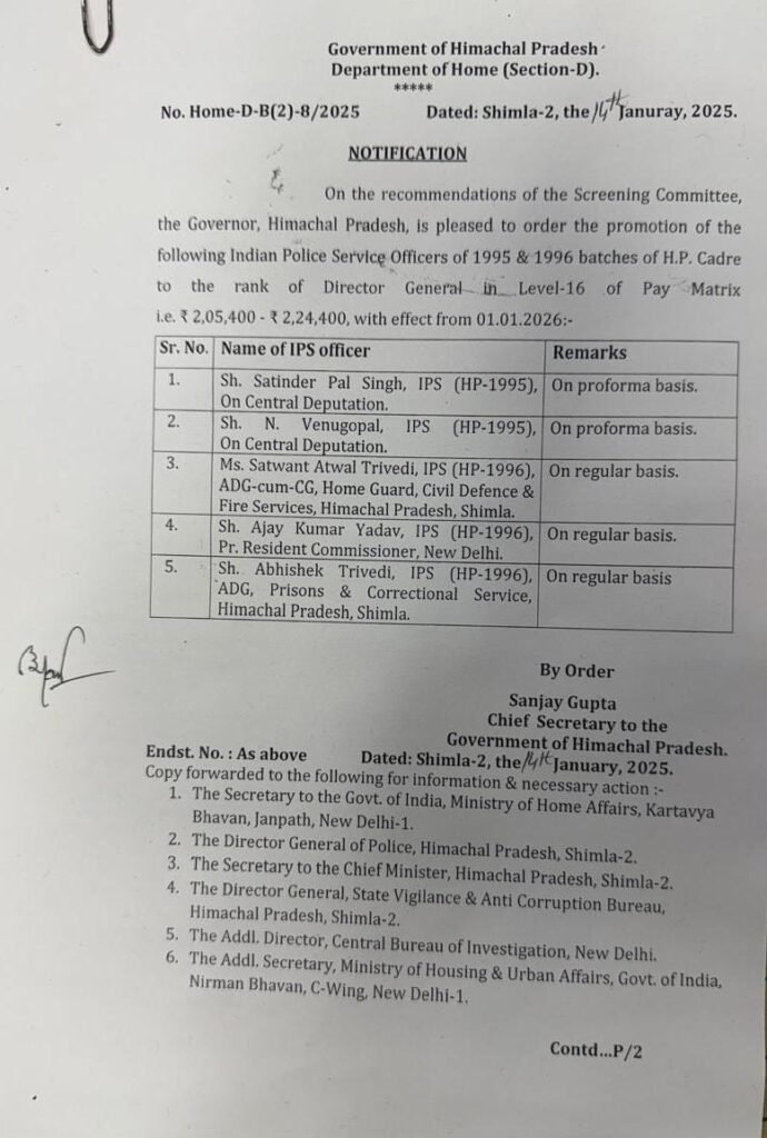 अधिसूचना के अनुसार इन अधिकारियों को पे मैट्रिक्स लेवल-16 (₹2,05,400 से ₹2,24,400) में पदोन्नत किया गया है। यह निर्णय स्क्रीनिंग कमेटी की सिफारिशों के आधार पर लिया गया है, जिसे राज्यपाल, हिमाचल प्रदेश की स्वीकृति प्राप्त हुई है।