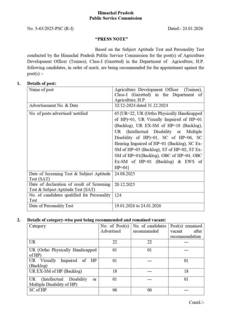हिमाचल प्रदेश लोक सेवा आयोग (HPSC) ने कृषि विभाग में कृषि विकास अधिकारी (ट्रेनी), क्लास-I (गज़टेड) पदों पर भर्ती के लिए आयोजित परीक्षा का अंतिम परिणाम घोषित कर दिया है। यह परिणाम विषय योग्यता परीक्षा (SAT) और पर्सनैलिटी टेस्ट के आधार पर जारी किया गया है।