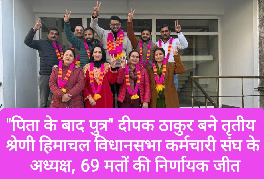 हिमाचल प्रदेश विधानसभा सचिवालय तृतीय श्रेणी कर्मचारी संघ के चुनावों में अर्की निवासी दीपक ठाकुर ने अध्यक्ष पद पर भारी बहुमत से जीत दर्ज की है। कुल 85 मतों में से उन्हें 69 मत प्राप्त हुए, जबकि उनके निकटतम प्रतिद्वंदी सुरिंदर कुमार को 16 मत मिले।