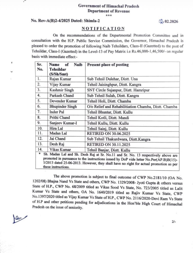 हिमाचल प्रदेश सरकार ने प्रदेश के विभिन्न क्षेत्रों में कार्यरत 14 नायब तहसीलदारों को पदोन्नत कर तहसीलदार नियुक्त किया है। सरकार की ओर से जारी आदेशों के तहत इन अधिकारियों को प्रदेश की अलग-अलग तहसीलों में नई जिम्मेदारियां सौंपी गई हैं। आदेश तत्काल प्रभाव से लागू हो गए हैं।