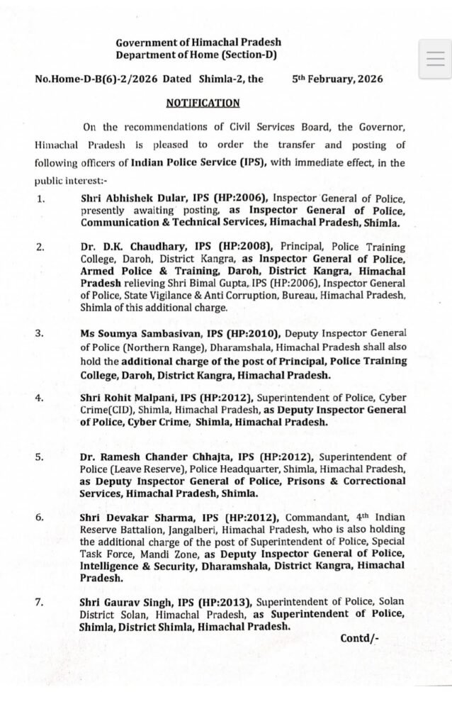 हिमाचल प्रदेश सरकार ने सिविल सर्विसेज बोर्ड की सिफारिशों पर भारतीय पुलिस सेवा (IPS) के वरिष्ठ अधिकारियों के तबादले व नई नियुक्तियों के आदेश जारी किए हैं।