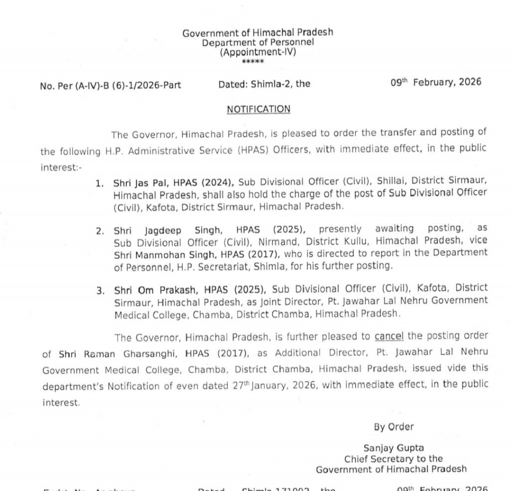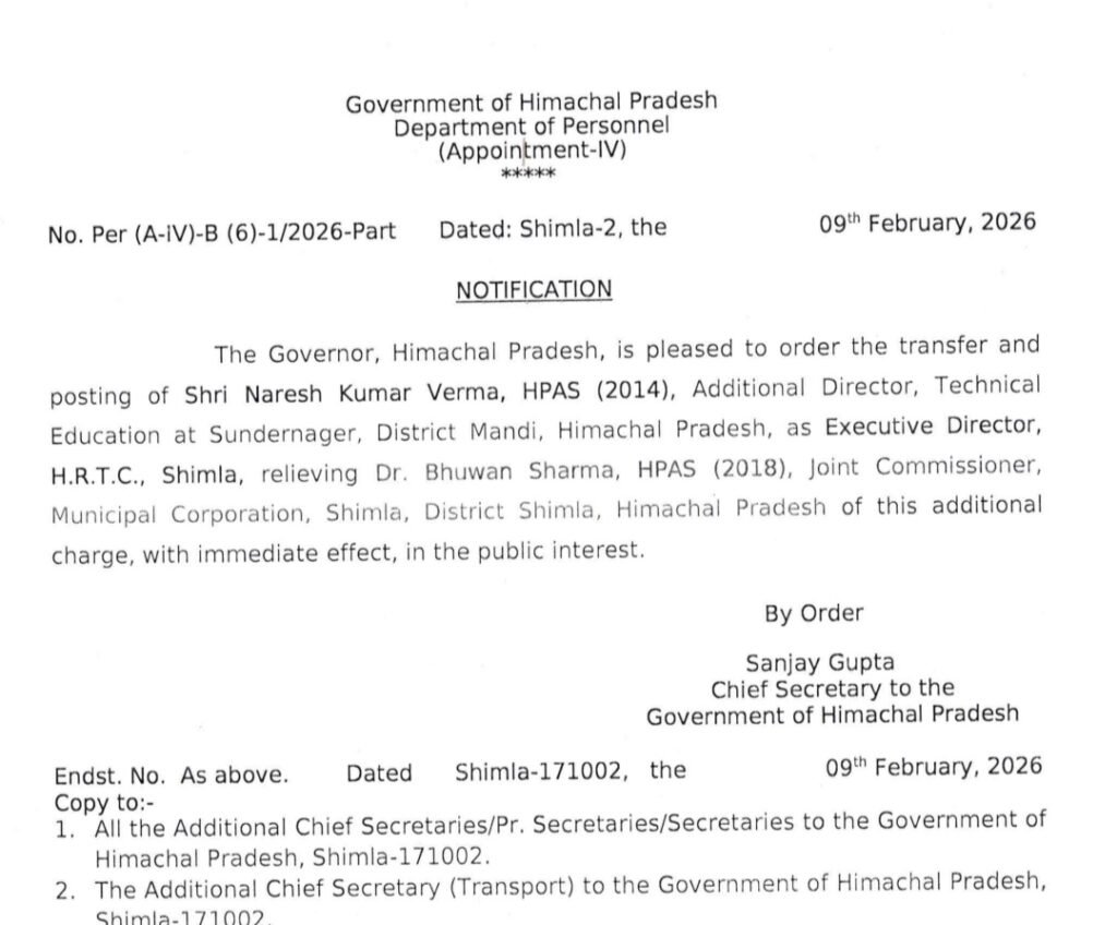 शिमला: हिमाचल प्रदेश सरकार ने एक और प्रशासनिक आदेश जारी करते हुए HPAS अधिकारी नरेश कुमार वर्मा (2014 बैच) का तबादला किया है। यह आदेश कार्मिक विभाग (Appointment-IV) द्वारा 9 फरवरी 2026 को जारी किया गया है और तत्काल प्रभाव से लागू होगा।
