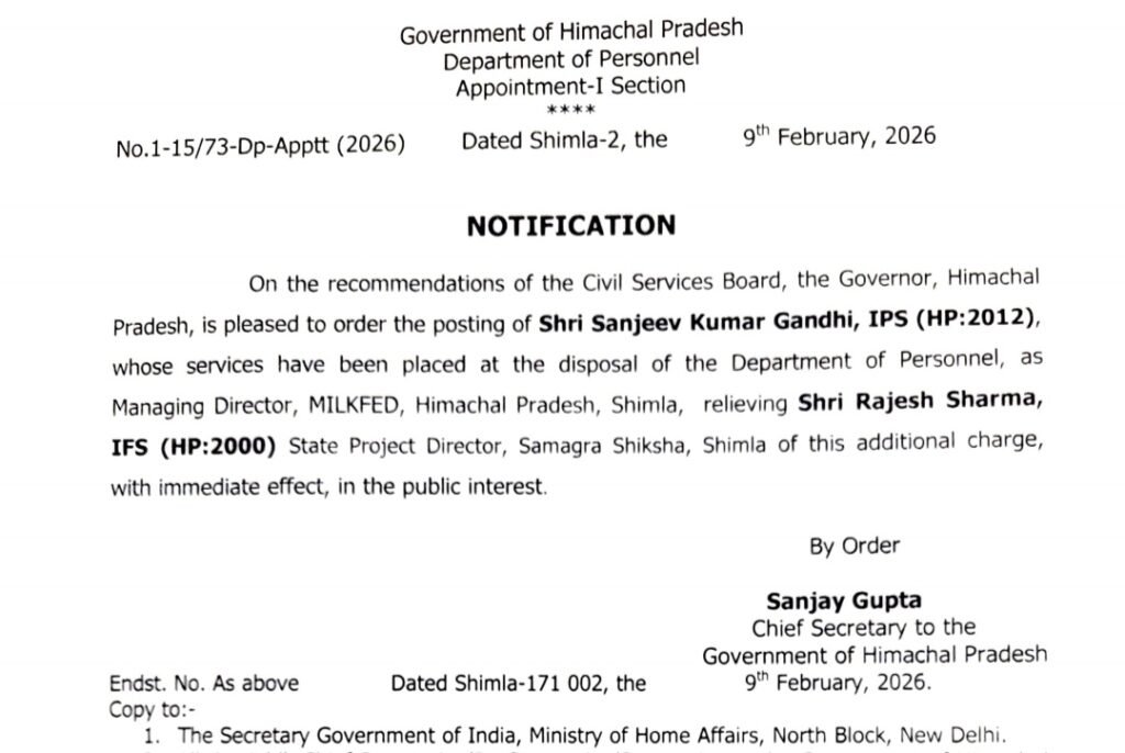 हिमाचल सरकार का प्रशासनिक आदेश: संजीव कुमार गांधी बने MILKFED के एमडी