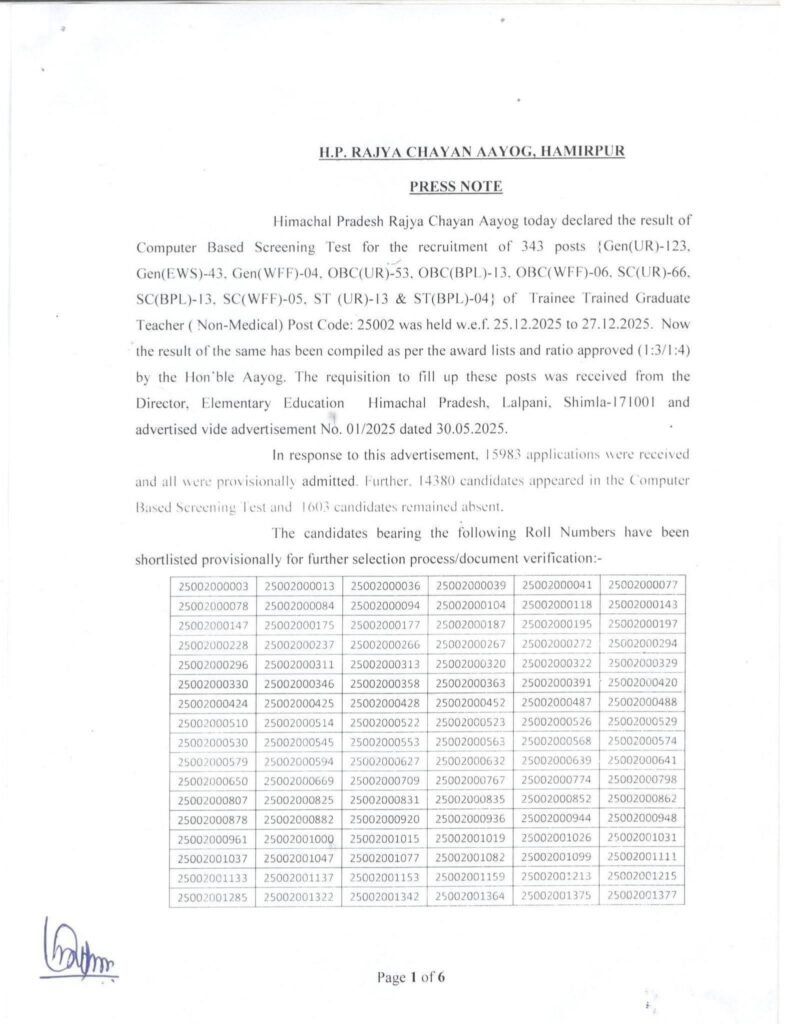 Himachal Pradesh Rajya Chayan Aayog ने टीजीटी (नॉन-मेडिकल) पोस्ट कोड 25002 के तहत आयोजित कंप्यूटर आधारित स्क्रीनिंग परीक्षा का परिणाम घोषित कर दिया है। यह भर्ती प्रक्रिया 343 पदों को भरने के लिए आयोजित की गई थी।
