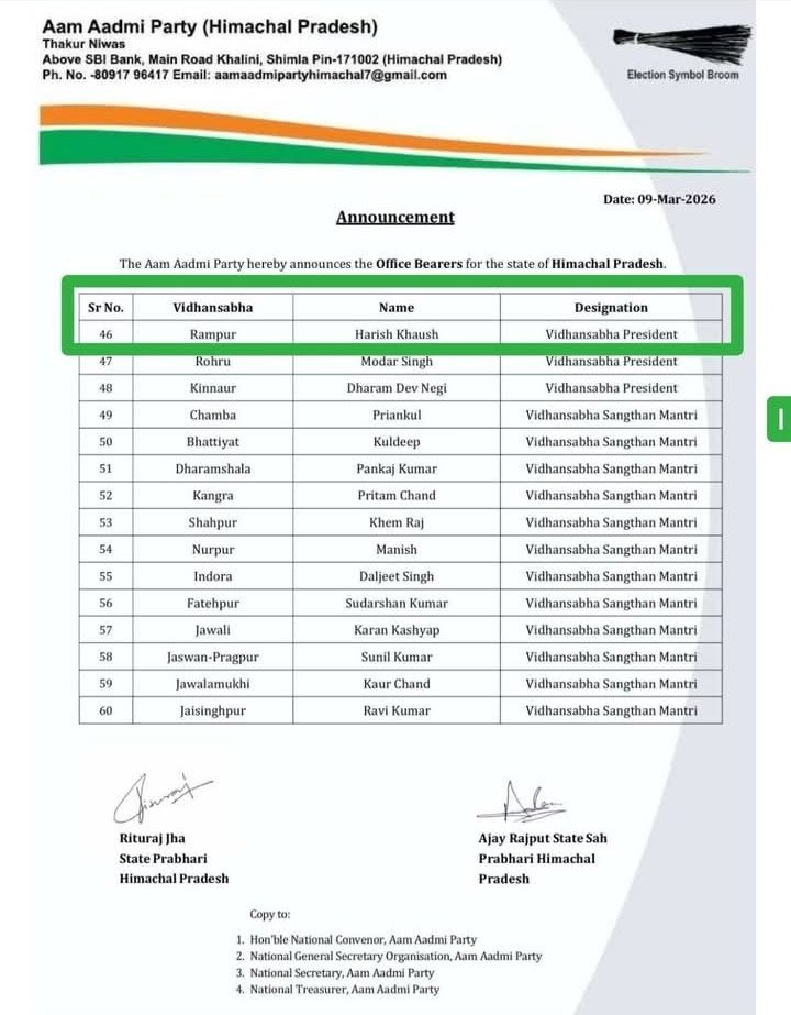 यह घोषणा Aam Aadmi Party हिमाचल प्रदेश इकाई द्वारा 9 मार्च 2026 को जारी आधिकारिक सूची में की गई है। पार्टी की ओर से जारी इस सूची पर राज्य प्रभारी Ajay Rajput और राज्य प्रभारी Rituraj Jha के हस्ताक्षर भी दर्ज हैं।