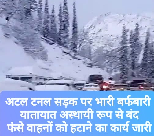 अटल टनल सड़क पर भारी बर्फबारी, यातायात अस्थायी रूप से बंद, फंसे वाहनों को हटाने का कार्य जारी