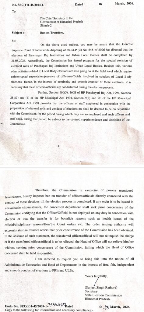 State Election Commission Himachal Pradesh ने पंचायत राज संस्थाओं और शहरी स्थानीय निकायों के आगामी चुनावों को निष्पक्ष और सुचारू रूप से संपन्न कराने के लिए महत्वपूर्ण फैसला लेते हुए अधिकारियों और कर्मचारियों के स्थानांतरण पर रोक लगा दी है।
