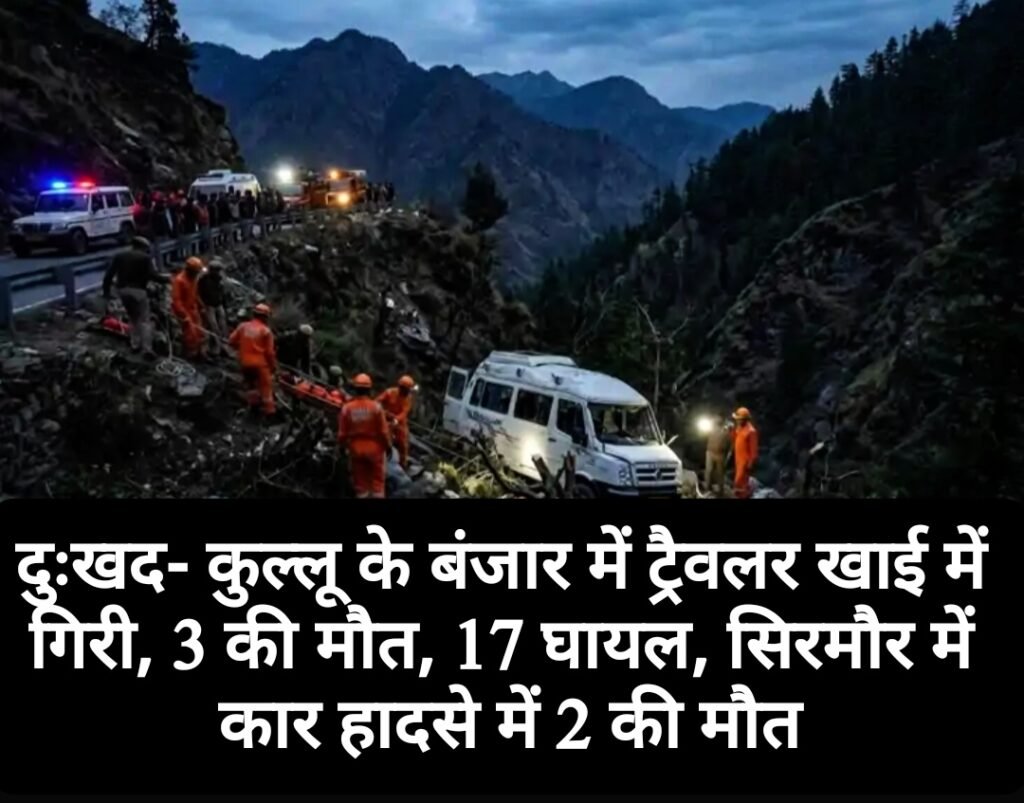 हिमाचल प्रदेश में शनिवार को दो अलग-अलग सड़क हादसों ने पूरे प्रदेश को झकझोर कर रख दिया। जिले के बंजार क्षेत्र में एक टैम्पो ट्रैवलर गहरी खाई में गिरने से तीन पर्यटकों की मौके पर ही मौत हो गई, जबकि 17 लोग घायल हो गए। वहीं जिले में हुए एक अन्य हादसे में दो युवकों की जान चली गई।