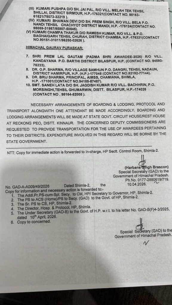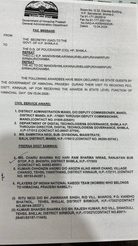 यह सम्मान समारोह रिकांगपिओ में आयोजित राज्यस्तरीय कार्यक्रम में होगा, जहां मुख्यमंत्री सुखविंदर सिंह सुक्खू पुरस्कार प्रदान करेंगे।