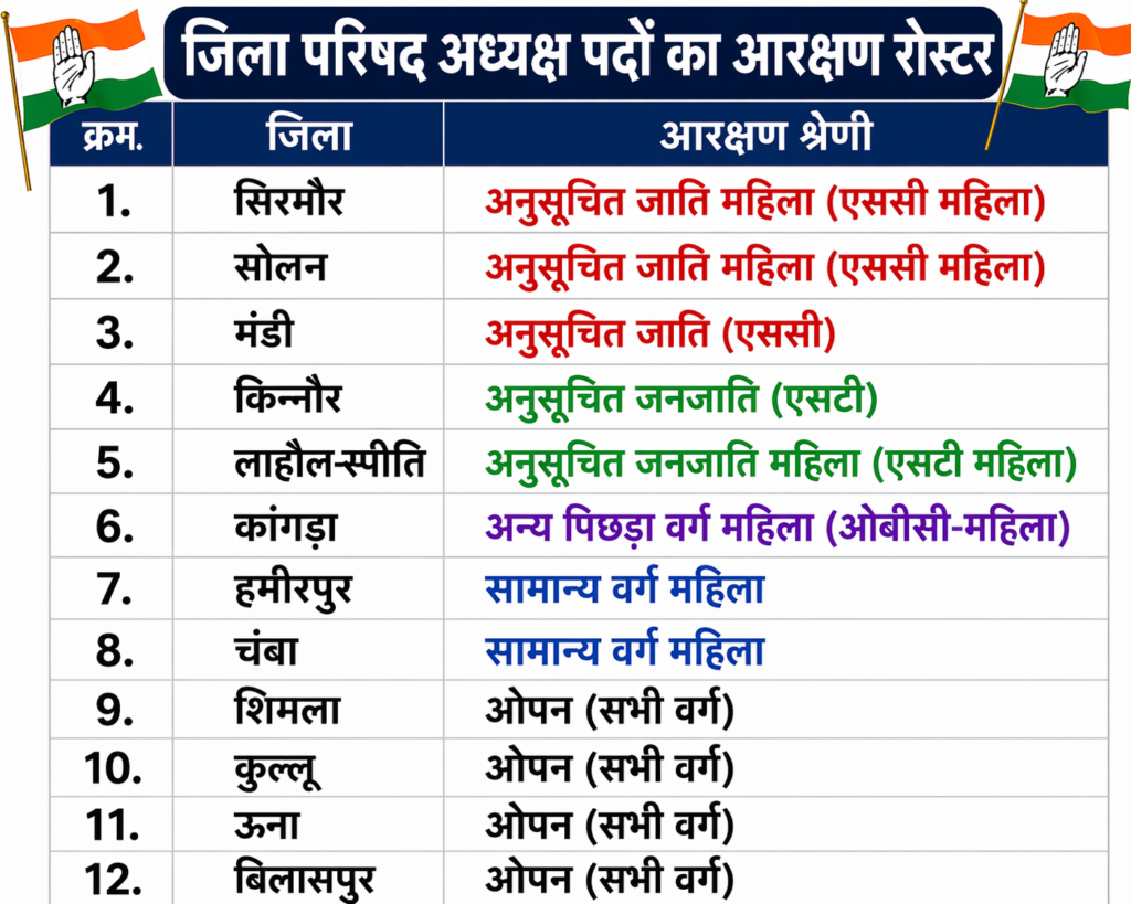 हिमाचल प्रदेश में आगामी पंचायत चुनावों से पहले जिला परिषद अध्यक्ष पदों के लिए आरक्षण रोस्टर तय कर दिया गया है।