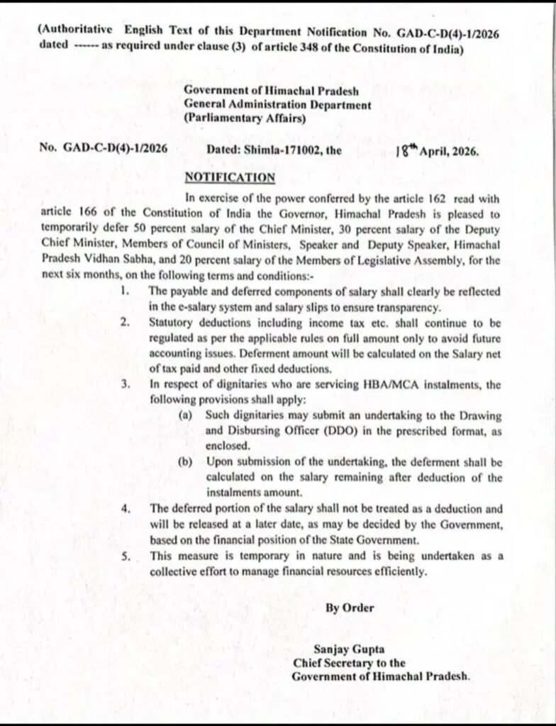 हिमाचल प्रदेश में वित्तीय स्थिति को देखते हुए एक बड़ा फैसला लिया गया है। राज्यपाल ने अपने अधिकारों का उपयोग करते हुए मुख्यमंत्री, उपमुख्यमंत्री, मंत्रियों और विधायकों के वेतन का एक हिस्सा अगले 6 महीनों के लिए अस्थायी रूप से स्थगित कर दिया है। इस संबंध में अधिसूचना जारी कर दी गई है।