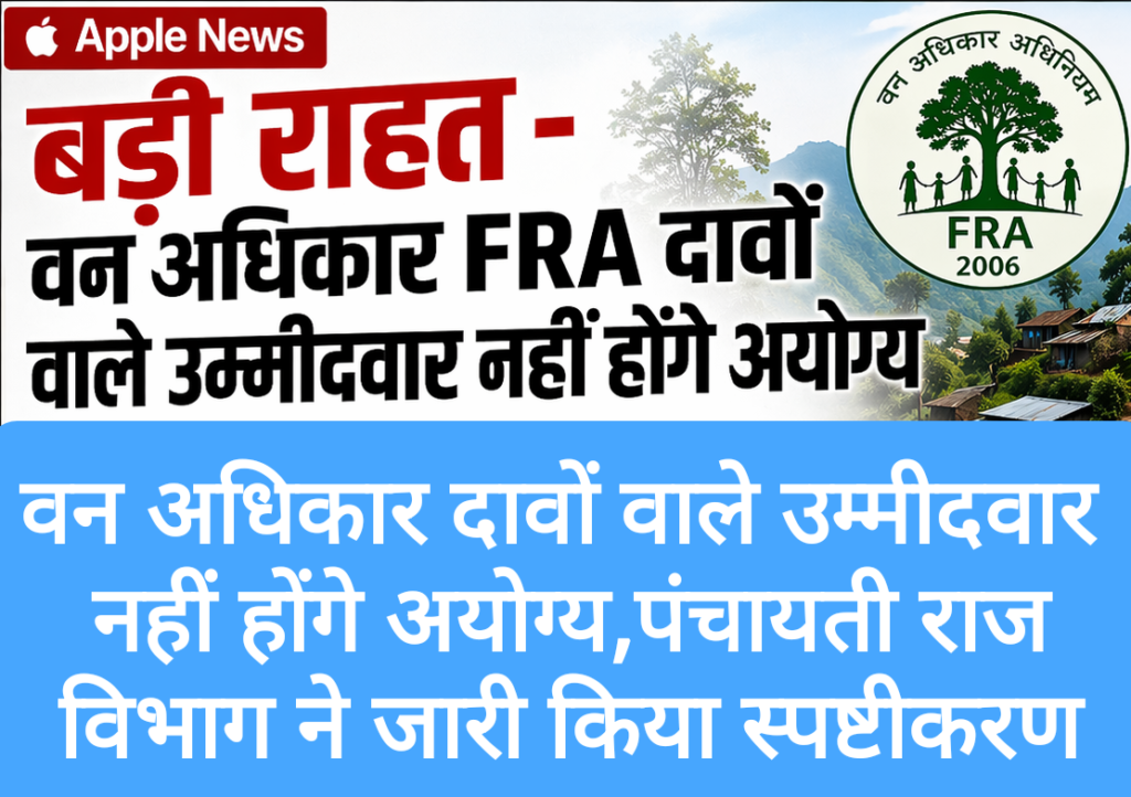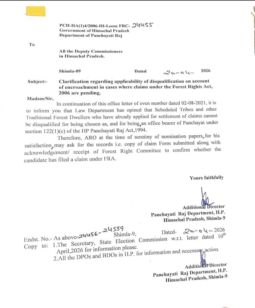 Government of Himachal Pradesh के Panchayati Raj Department ने पंचायत चुनावों से जुड़ा एक महत्वपूर्ण स्पष्टीकरण जारी करते हुए स्पष्ट किया है कि Forest Rights Act, 2006 के तहत दावे दाखिल करने वाले व्यक्तियों को केवल अतिक्रमण के आधार पर अयोग्य नहीं ठहराया जा सकता।