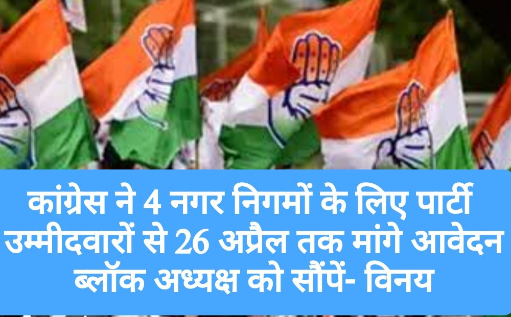 प्रदेश कांग्रेस अध्यक्ष विनय कुमार ने चार नगर निगमों सोलन, मंडी,पालमपुर व धर्मशाला के चुनाव के लिये पार्टी उम्मीदवारों से 26 अप्रैल तक आवेदन आमंत्रित किये है।